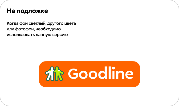 У логотипа четыре базовые составляющие: знак (графическая часть в виде двух людей), фирменные цвета и написание «Goodline» + слоган (текстовая часть). Их совместное использование обеспечивает узнаваемость и прочную визуальную связь с брендом