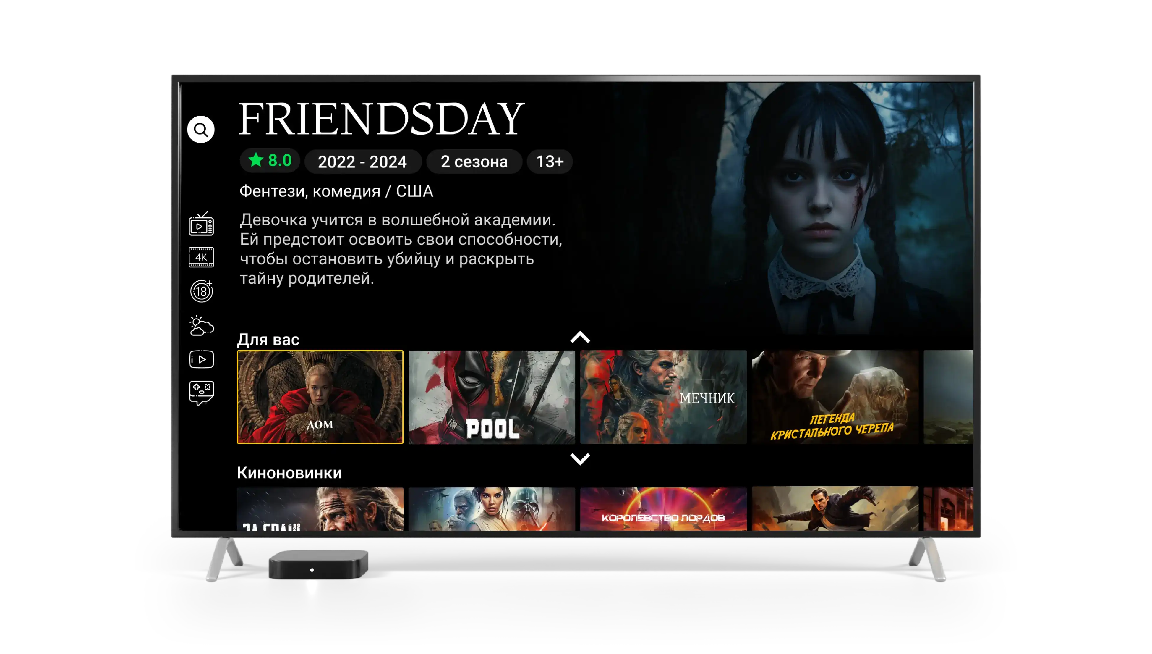 «Большое ТВ» от Goodline – это современная ТВ-приставка, предоставляющая доступ к широкому спектру развлекательного контента. Основные характеристики и преимущества устройства включают: • Большой выбор ТВ-каналов, в том числе в HD-качестве; • 20 000+ фильмов, сериалов и мультфильмов; • VK Видео на большом экране; • подборки фильмов и сериалов; • бесплатный ТВ-архив на популярных каналах.